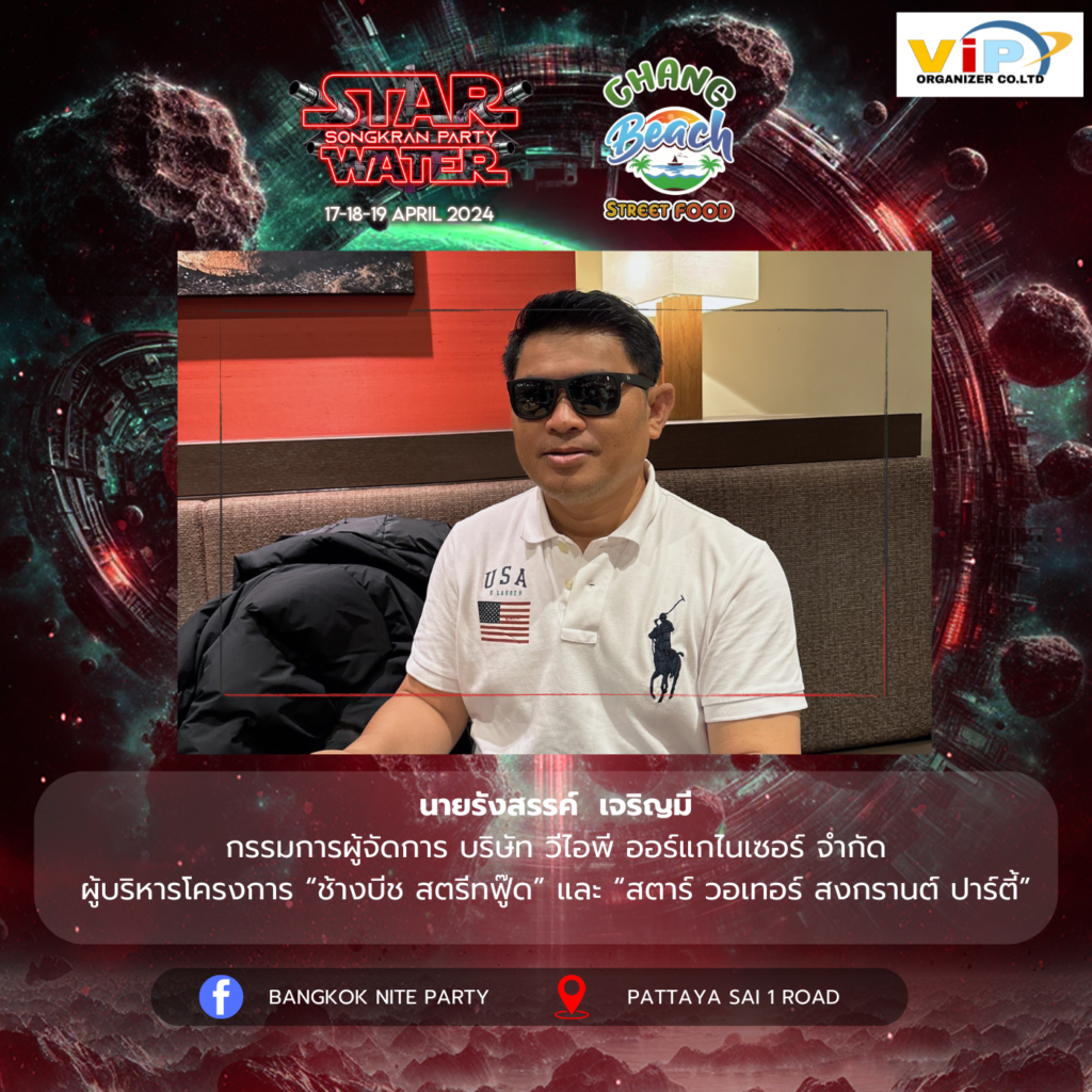คุณรังสรรค์ เจริญมี ผู้บริหาร บริษัท วี ไอ พี ออร์แกไนเซอร์ จำกัด และคุณทรงสิทธา จันทรา ร่วมกันจัดงานสงครามสายน้ำ ที่เมืองพัทยา ถนนพัทยาสาย 1 ชวนนักเที่ยวเตรียมตัวให้พร้อมในวันที่ 17-19 เมษายน 2567 พบกับศิลปินโจล่ง แรปเปอร์ No.1 ของประเทศไทย และเหล่าดีเจ และ MC ชื่อดัง กว่า 10 ชีวิต และพลาดไม่ได้ กับเซ็กซี่สตาร์ตัวแม่ ของประชาชนชายไทย กับน้องแนท เกศริน พร้อมเหล่าอินฟลูเอ็นเซอร์ชื่อดัง ดังเช่น น้องโอลีฟ โตเกียวเนยกรอบ น้องยูมิโกะ และเพื่อน ๆ กว่า 10 ชีวิต มาสนุก มาโดด มาเปียกแฉะฉ่ำ ๆ ไปด้วยกัน แล้วพบกัน !!!