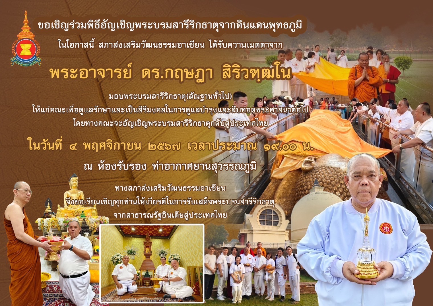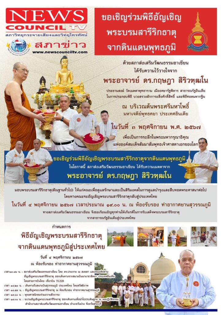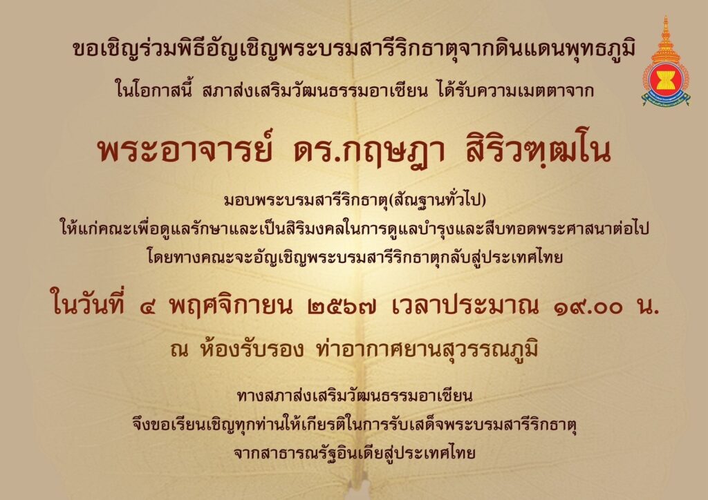 สภาส่งเสริมวัฒนธรรมอาเซียน โดย ดร.ประกาย ณ สงขลา และคณะผู้ติดตาม อัญเชิญพระบรมสารีริกธาตุจากอินเดียสู่ไทย เพื่อให้พุทธศาสนิกชนถวายสักการะ ในวันที่ 4 พ.ย. 2567